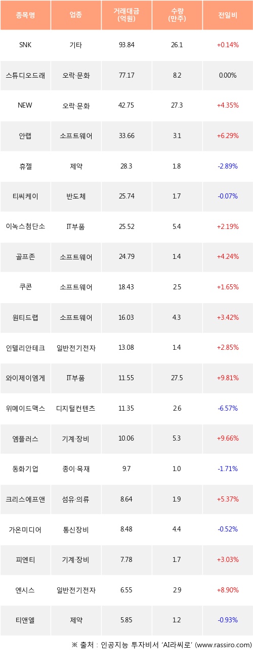 SNK, NEW, 안랩 등은 전일 대비 주가가 상승했고, 휴젤, 티씨케이, 위메이드맥스 등은 주가가 하락했다.