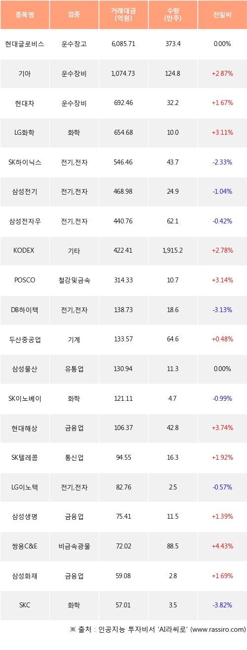 외국인 투자자의 순매수 상위 20개 종목은 현대글로비스, 기아, 현대차, LG화학, SK하이닉스, 삼성전기, 삼성전자우, KODEX 200선물인버스2X, POSCO, DB하이텍등이다.