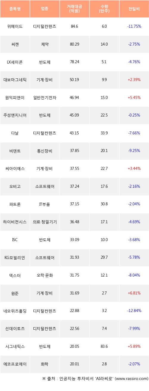 대보마그네틱, 원익피앤이, 씨아이에스 등은 전일 대비 주가가 상승했고, 위메이드, 씨젠, LX세미콘 등은 주가가 하락했다.