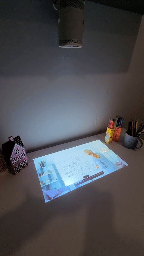 현장에서 삼성전자 직원은 "180도 자유자재로 회전해 어디에서나 원하는 각도로 비춰서 사용할 수 있다"면서 다양한 각도도 기기를 세팅하는 모습도 보였다. 가장 눈에 띄었던 포인트는 책상에서의 사용이었다. 기기를 상단에 고정시켜 책상으로 비출 경우 책상 바닥이 그대로 스크린이 돼 영상을 활용한 공부가 가능했다. 반대로 책상에 고정시킬 경우 책상 벽이 스크린이 됐다.