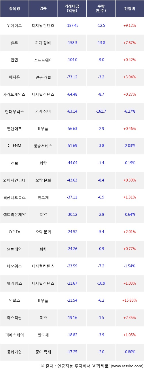 기관 투자자의 순매도 상위 20개 종목은 위메이드, 원준, 안랩, 메지온, 카카오게임즈, 현대무벡스, 엘앤에프, CJ ENM, 천보, 와이지엔터테인먼트등이다.