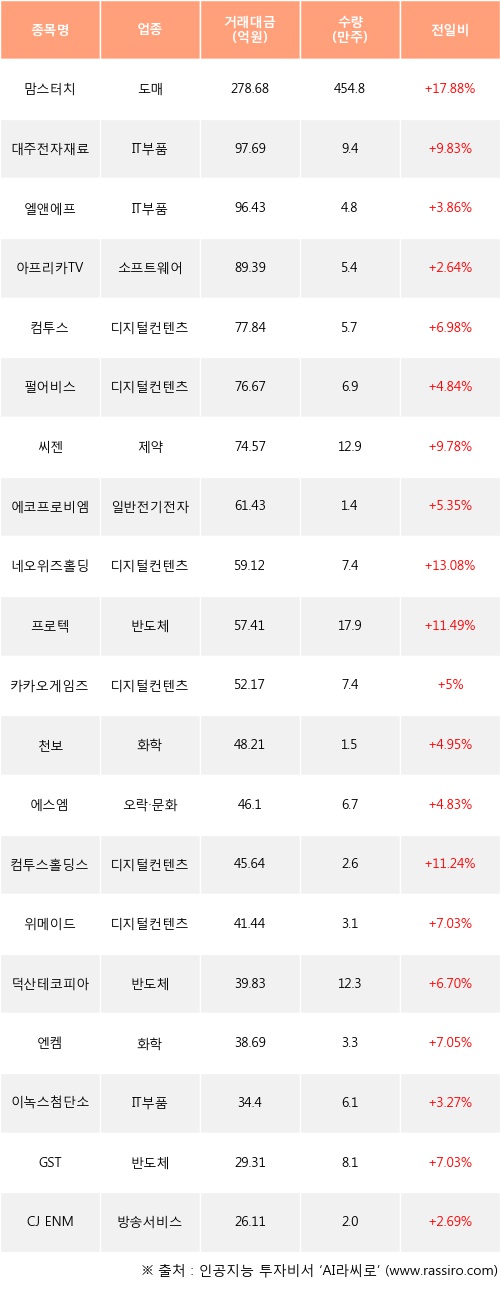 기관 투자자의 순매수 상위 20개 종목은 맘스터치, 대주전자재료, 엘앤에프, 아프리카TV, 컴투스, 펄어비스, 씨젠, 에코프로비엠, 네오위즈홀딩스, 프로텍등이다.