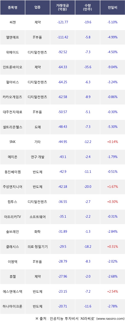 외국인 투자자의 순매도 상위 20개 종목은 씨젠, 엘앤에프, 위메이드, 인트론바이오, 펄어비스, 카카오게임즈, 대주전자재료, 셀트리온헬스케어, SNK, 메지온등이다.