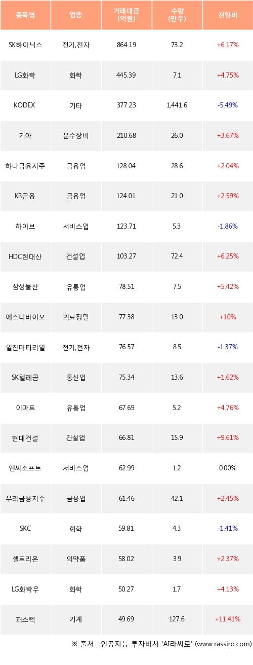 SK하이닉스, LG화학, 기아 등은 전일 대비 주가가 상승했고, KODEX 200선물인버스2X, 하이브, 일진머티리얼즈 등은 주가가 하락했다.