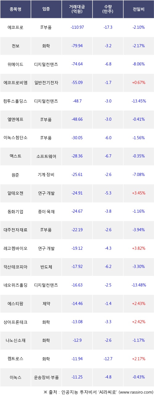 기관 투자자의 순매도 상위 20개 종목은 에코프로, 천보, 위메이드, 에코프로비엠, 컴투스홀딩스, 엘앤에프, 이녹스첨단소재, 맥스트, 원준, 알테오젠등이다.