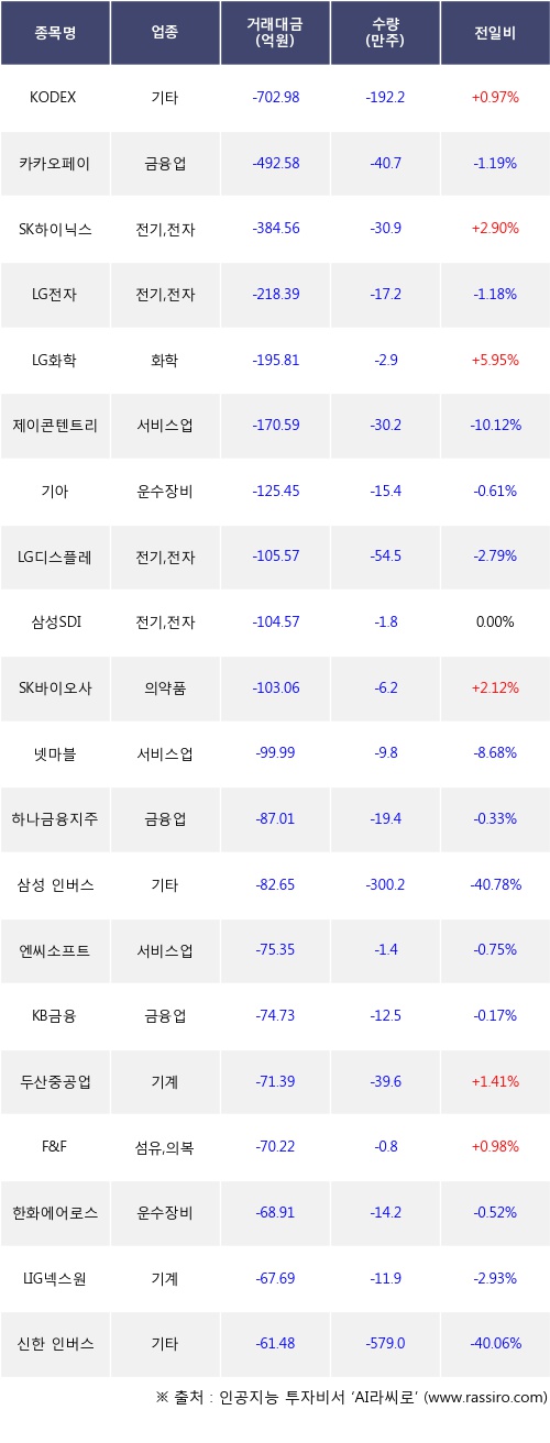 기관 투자자의 순매도 상위 20개 종목은 KODEX 200, 카카오페이, SK하이닉스, LG전자, LG화학, 제이콘텐트리, 기아, LG디스플레이, 삼성SDI, SK바이오사이언스등이다.