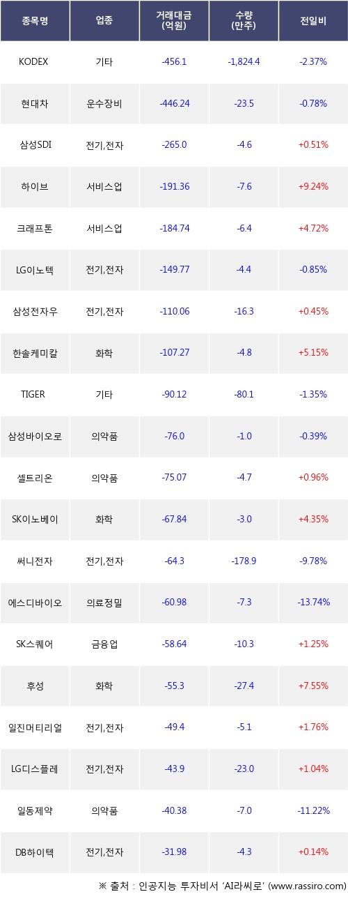 외국인 투자자의 순매도 상위 20개 종목은 KODEX 200선물인버스2X, 현대차, 삼성SDI, 하이브, 크래프톤, LG이노텍, 삼성전자우, 한솔케미칼, TIGER 미국필라델피아반도체나스닥, 삼성바이오로직스등이다.