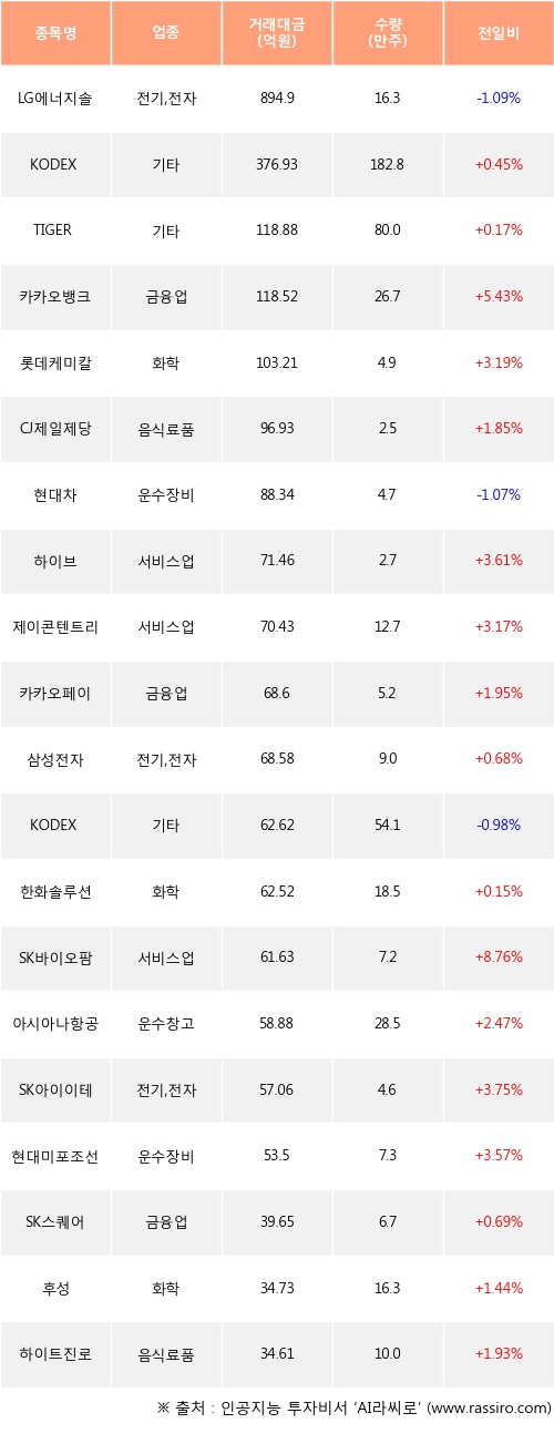 KODEX 레버리지, TIGER MSCI Korea TR, 카카오뱅크 등은 전일 대비 주가가 상승했고, LG에너지솔루션, 현대차, KODEX 코스닥150 레버리지 등은 주가가 하락했다.