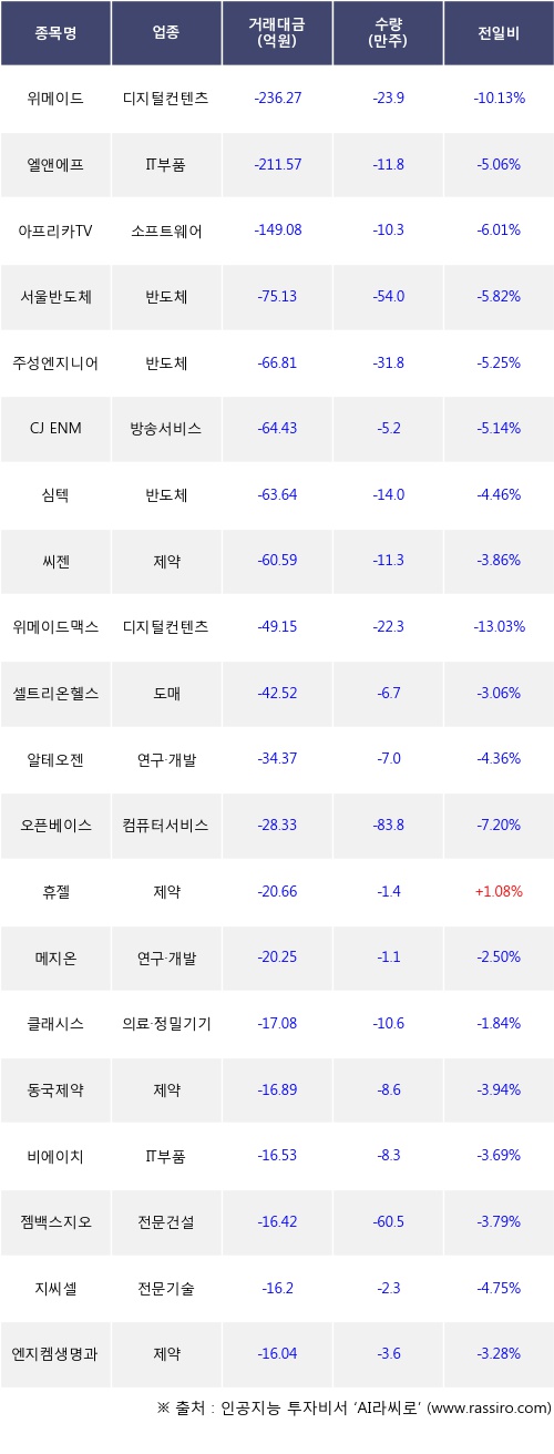외국인 투자자의 순매도 상위 20개 종목은 위메이드, 엘앤에프, 아프리카TV, 서울반도체, 주성엔지니어링, CJ ENM, 심텍, 씨젠, 위메이드맥스, 셀트리온헬스케어등이다.