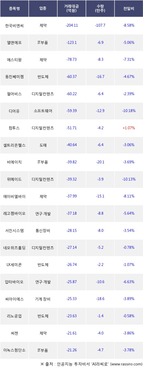 기관 투자자의 순매도 상위 20개 종목은 한국비엔씨, 엘앤에프, 에스티팜, 동진쎄미켐, 펄어비스, 디어유, 컴투스, 셀트리온헬스케어, 비에이치, 위메이드등이다.