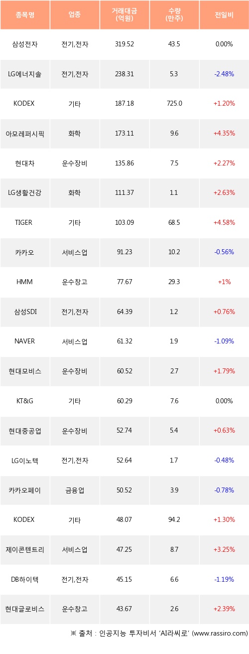 KODEX 200선물인버스2X, 아모레퍼시픽, 현대차 등은 전일 대비 주가가 상승했고, LG에너지솔루션, 카카오, NAVER 등은 주가가 하락했다.