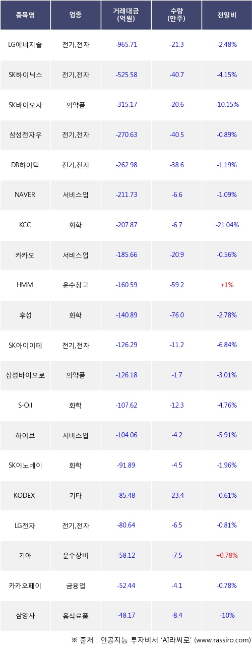 외국인 투자자의 순매도 상위 20개 종목은 LG에너지솔루션, SK하이닉스, SK바이오사이언스, 삼성전자우, DB하이텍, NAVER, KCC, 카카오, HMM, 후성등이다.