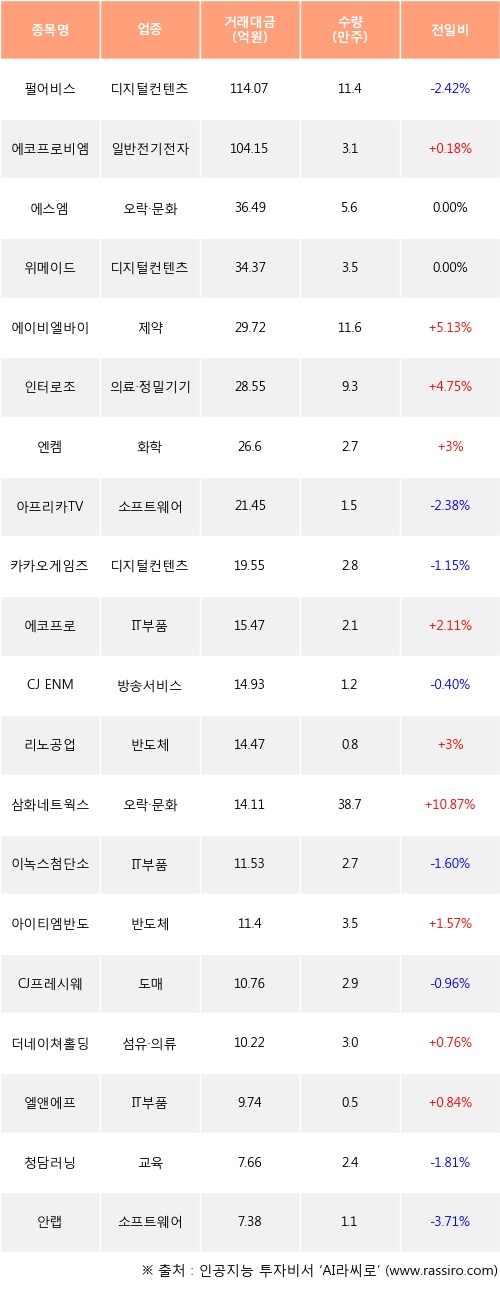 에코프로비엠, 에이비엘바이오, 인터로조 등은 전일 대비 주가가 상승했고, 펄어비스, 아프리카TV, 카카오게임즈 등은 주가가 하락했다.
