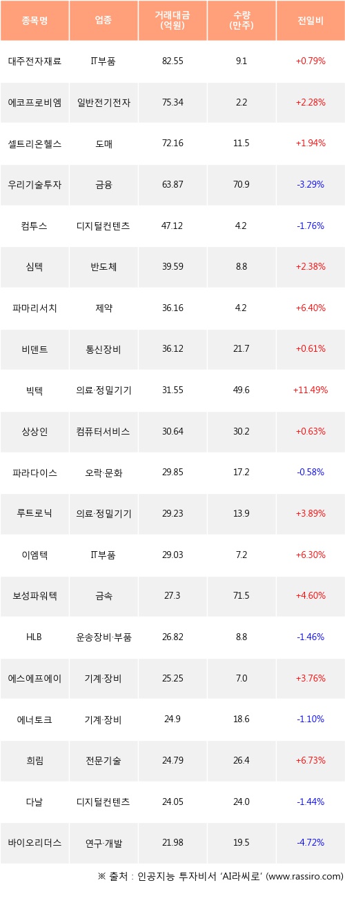 외국인 투자자의 순매수 상위 20개 종목은 대주전자재료, 에코프로비엠, 셀트리온헬스케어, 우리기술투자, 컴투스, 심텍, 파마리서치, 비덴트, 빅텍, 상상인등이다.