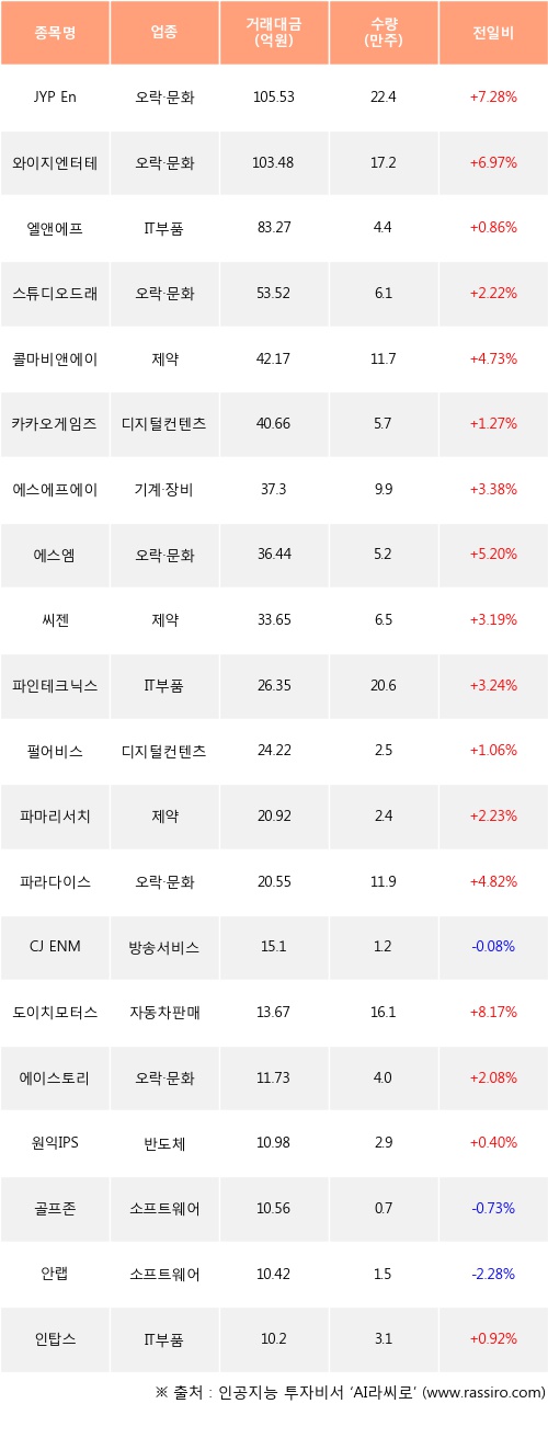 JYP Ent., 와이지엔터테인먼트, 엘앤에프 등은 전일 대비 주가가 상승했고, CJ ENM, 골프존, 안랩 등은 주가가 하락했다.