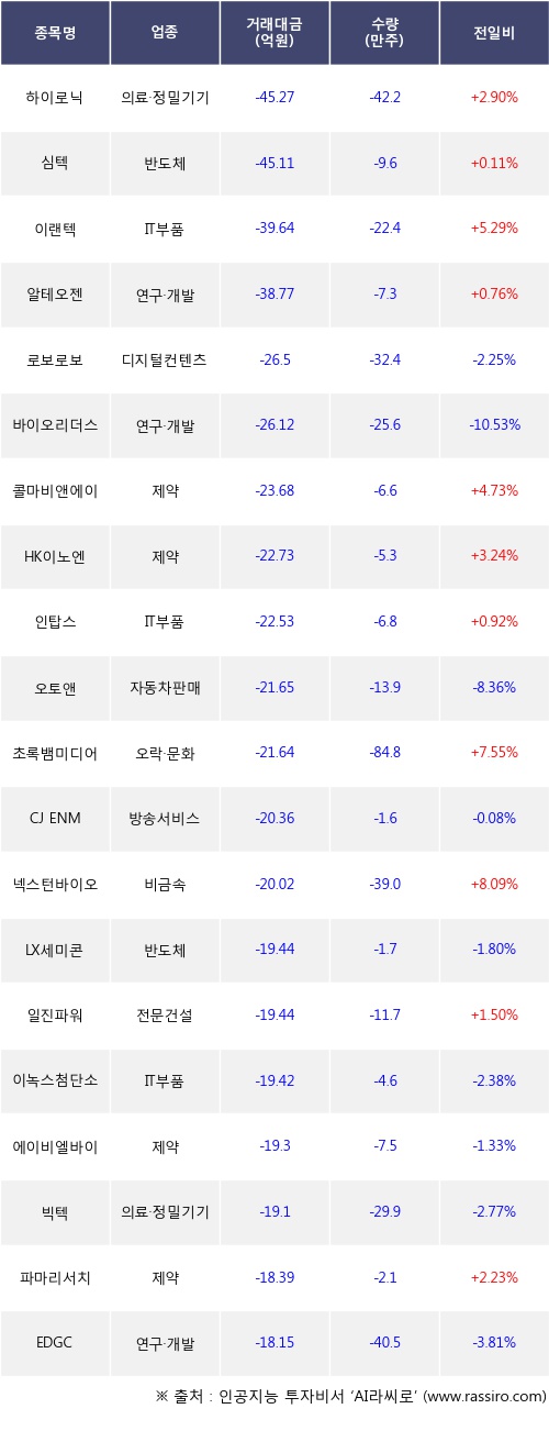외국인 투자자의 순매도 상위 20개 종목은 하이로닉, 심텍, 이랜텍, 알테오젠, 로보로보, 바이오리더스, 콜마비앤에이치, HK이노엔, 인탑스, 오토앤등이다.