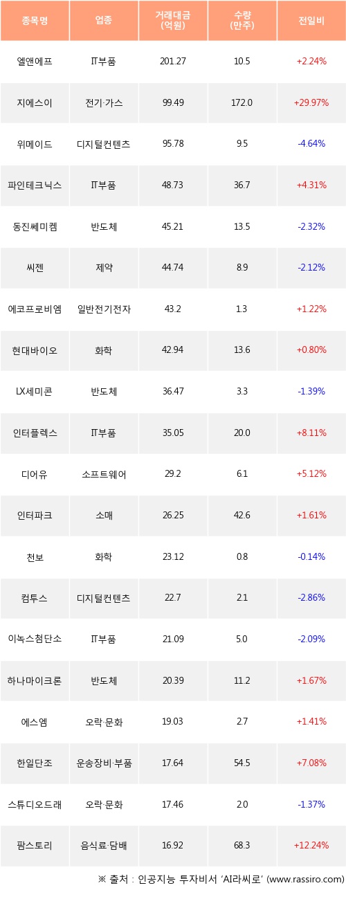 외국인 투자자의 순매수 상위 20개 종목은 엘앤에프, 지에스이, 위메이드, 파인테크닉스, 동진쎄미켐, 씨젠, 에코프로비엠, 현대바이오, LX세미콘, 인터플렉스등이다.