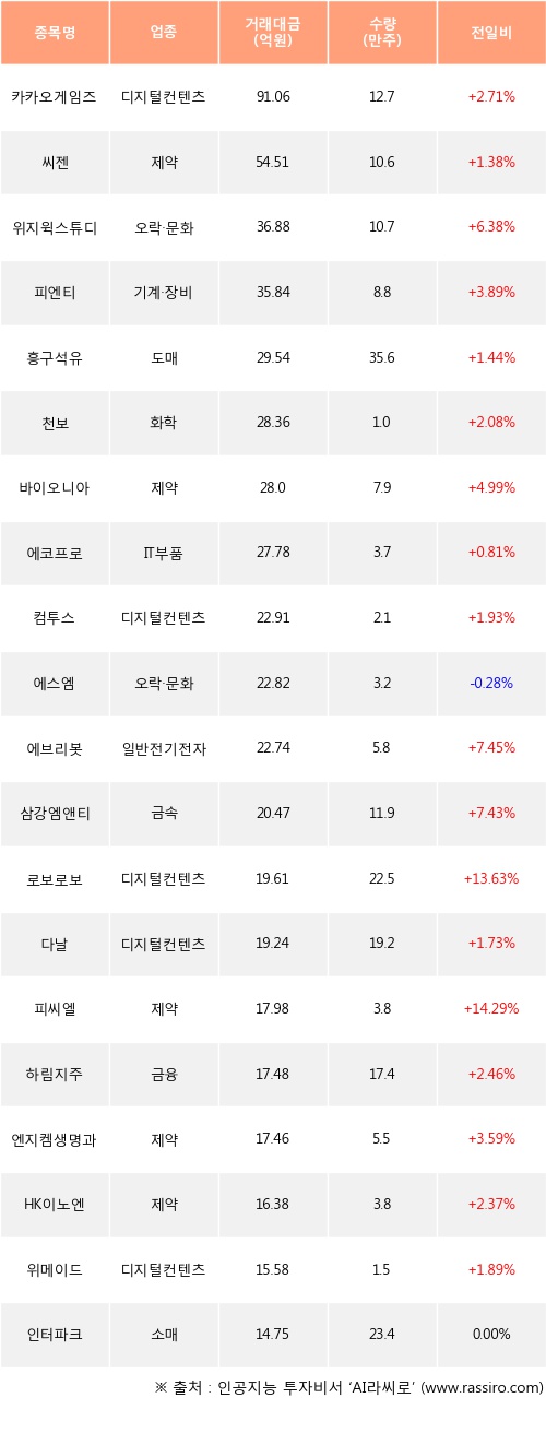 카카오게임즈, 씨젠, 위지윅스튜디오 등은 전일 대비 주가가 상승했고, 에스엠 등은 주가가 하락했다.