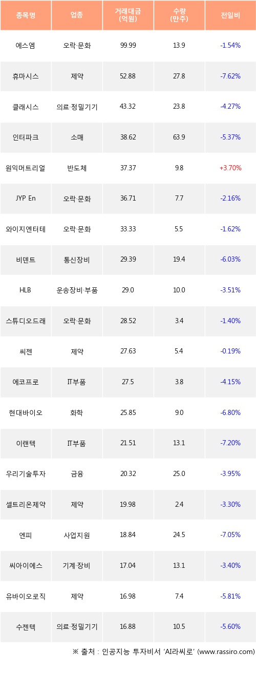 원익머트리얼즈 등은 전일 대비 주가가 상승했고, 에스엠, 휴마시스, 클래시스 등은 주가가 하락했다.