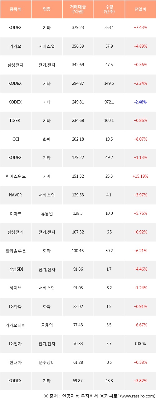 KODEX 코스닥150 레버리지, 카카오, 삼성전자 등은 전일 대비 주가가 상승했고, KODEX 200선물인버스2X 등은 주가가 하락했다.