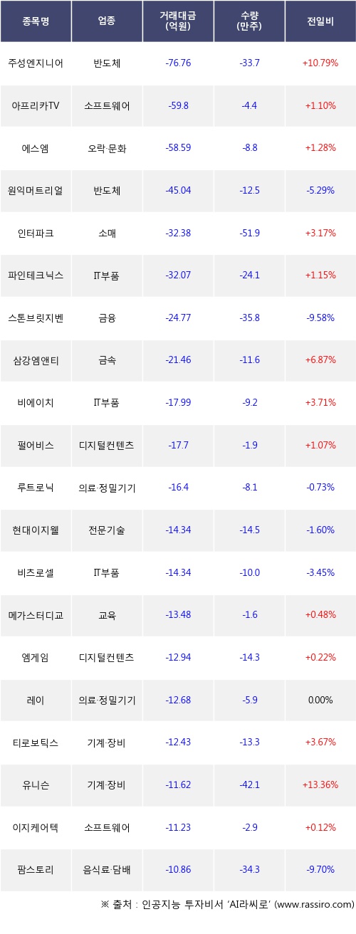 외국인 투자자의 순매도 상위 20개 종목은 주성엔지니어링, 아프리카TV, 에스엠, 원익머트리얼즈, 인터파크, 파인테크닉스, 스톤브릿지벤처스, 삼강엠앤티, 비에이치, 펄어비스등이다.