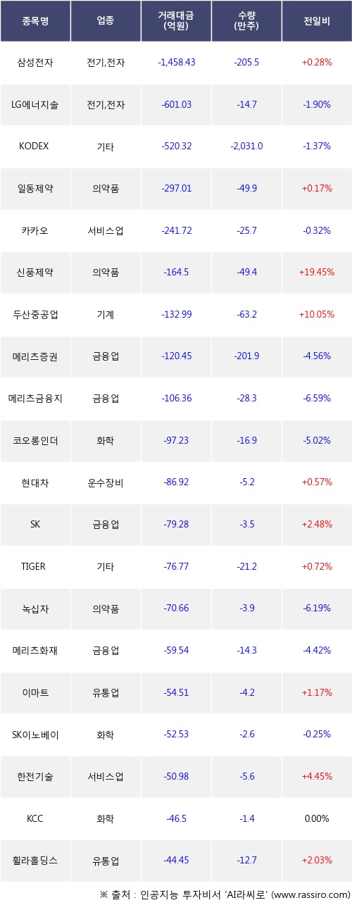 외국인 투자자의 순매도 상위 20개 종목은 삼성전자, LG에너지솔루션, KODEX 200선물인버스2X, 일동제약, 카카오, 신풍제약, 두산중공업, 메리츠증권, 메리츠금융지주, 코오롱인더등이다.