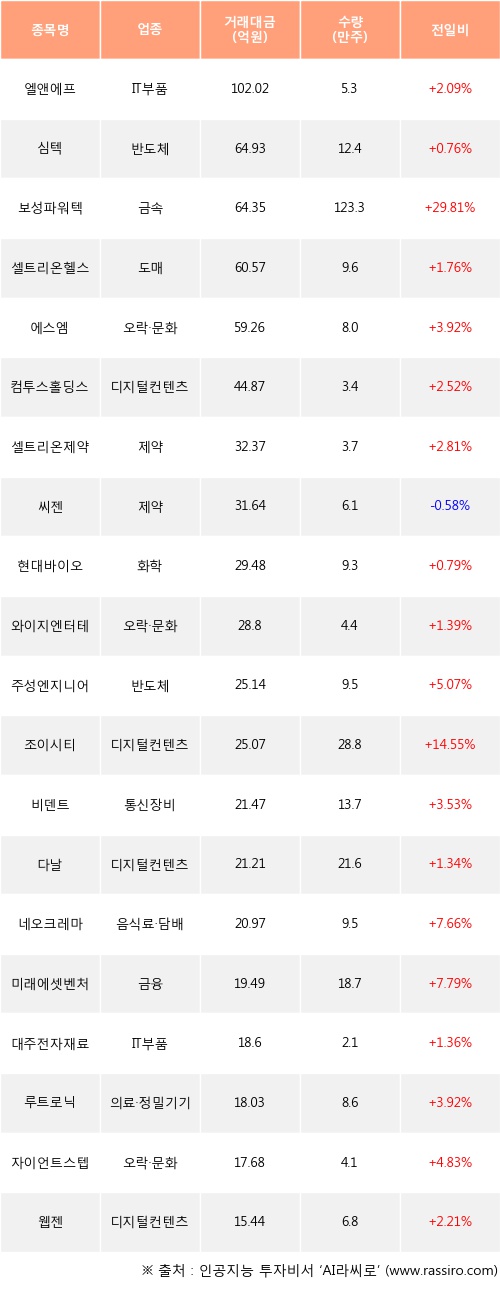 외국인 투자자의 순매수 상위 20개 종목은 엘앤에프, 심텍, 보성파워텍, 셀트리온헬스케어, 에스엠, 컴투스홀딩스, 셀트리온제약, 씨젠, 현대바이오, 와이지엔터테인먼트등이다.