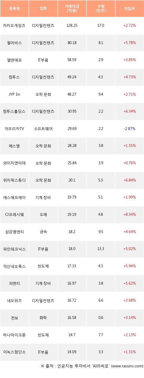 기관 투자자의 순매수 상위 20개 종목은 카카오게임즈, 펄어비스, 엘앤에프, 컴투스, JYP Ent., 컴투스홀딩스, 아프리카TV, 에스엠, 와이지엔터테인먼트, 위지윅스튜디오등이다.