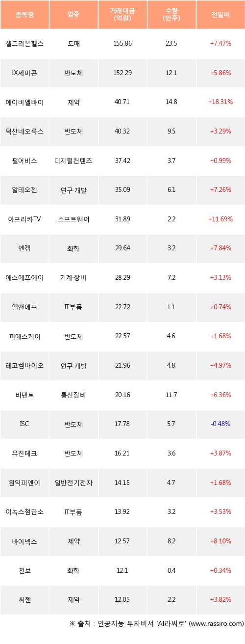 셀트리온헬스케어, LX세미콘, 에이비엘바이오 등은 전일 대비 주가가 상승했고, ISC 등은 주가가 하락했다.