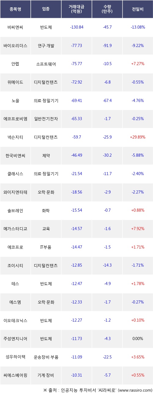 기관 투자자의 순매도 상위 20개 종목은 비씨엔씨, 바이오리더스, 안랩, 위메이드, 노을, 에코프로비엠, 넥슨지티, 한국비엔씨, 클래시스, 와이지엔터테인먼트등이다.