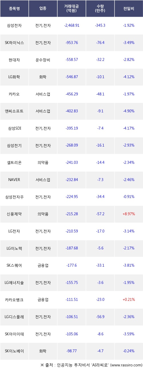 외국인 투자자의 순매도 상위 20개 종목은 삼성전자, SK하이닉스, 현대차, LG화학, 카카오, 엔씨소프트, 삼성SDI, 삼성전기, 셀트리온, NAVER등이다.