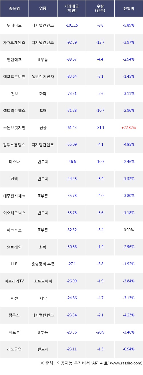 기관 투자자의 순매도 상위 20개 종목은 위메이드, 카카오게임즈, 엘앤에프, 에코프로비엠, 천보, 셀트리온헬스케어, 스톤브릿지벤처스, 컴투스홀딩스, 테스나, 심텍등이다.