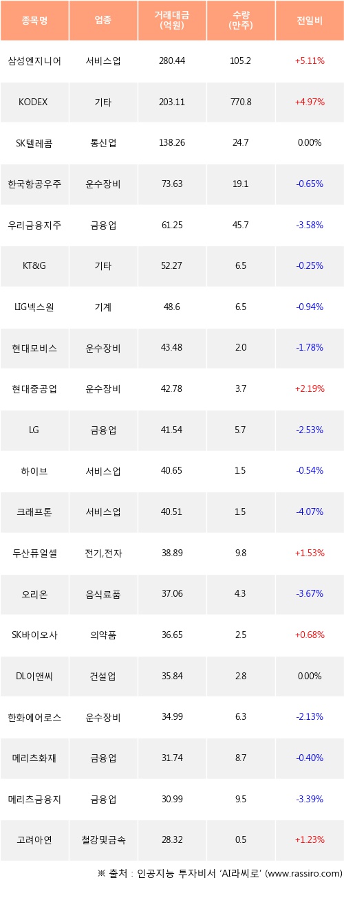 삼성엔지니어링, KODEX 200선물인버스2X, 현대중공업 등은 전일 대비 주가가 상승했고, 한국항공우주, 우리금융지주, KT&G 등은 주가가 하락했다.