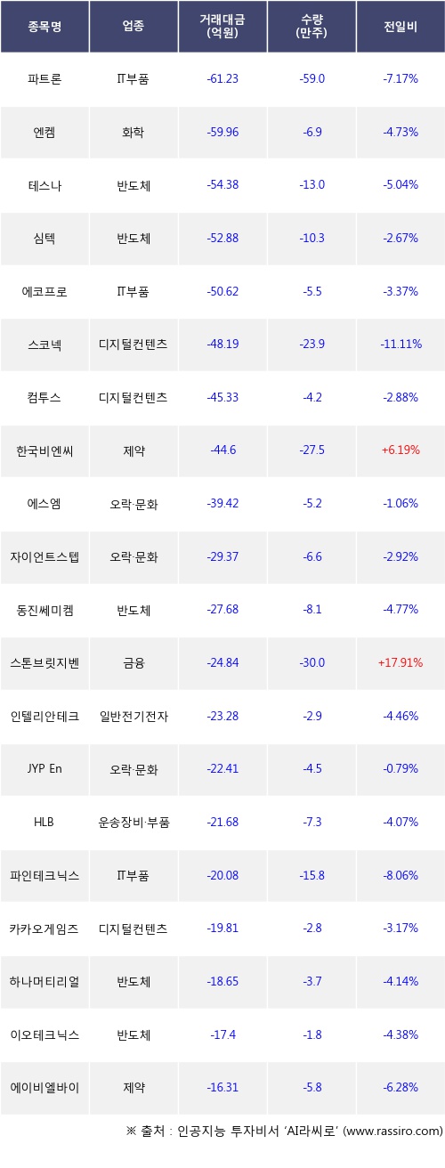기관 투자자의 순매도 상위 20개 종목은 파트론, 엔켐, 테스나, 심텍, 에코프로, 스코넥, 컴투스, 한국비엔씨, 에스엠, 자이언트스텝등이다.