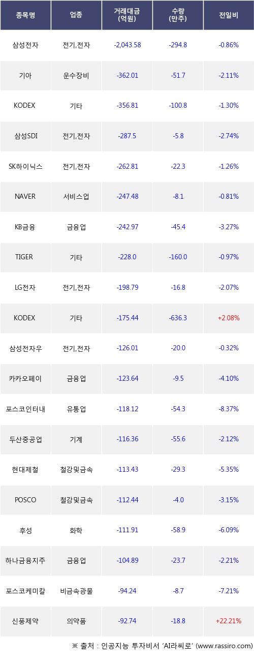 외국인 투자자의 순매도 상위 20개 종목은 삼성전자, 기아, KODEX 200, 삼성SDI, SK하이닉스, NAVER, KB금융, TIGER MSCI Korea TR, LG전자, KODEX 200선물인버스2X등이다.