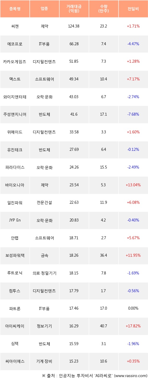 씨젠, 카카오게임즈, 맥스트 등은 전일 대비 주가가 상승했고, 에코프로, 와이지엔터테인먼트, 주성엔지니어링 등은 주가가 하락했다.