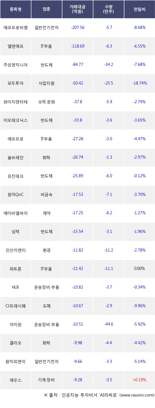 기관 투자자의 순매도 상위 20개 종목은 에코프로비엠, 엘앤에프, 주성엔지니어링, 모두투어, 와이지엔터테인먼트, 이오테크닉스, 에코프로, 솔브레인, 유진테크, 원익QnC등이다.