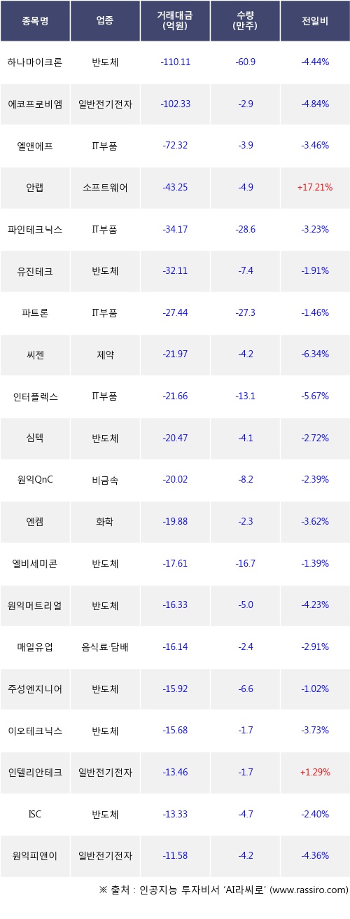 기관 투자자의 순매도 상위 20개 종목은 하나마이크론, 에코프로비엠, 엘앤에프, 안랩, 파인테크닉스, 유진테크, 파트론, 씨젠, 인터플렉스, 심텍등이다.