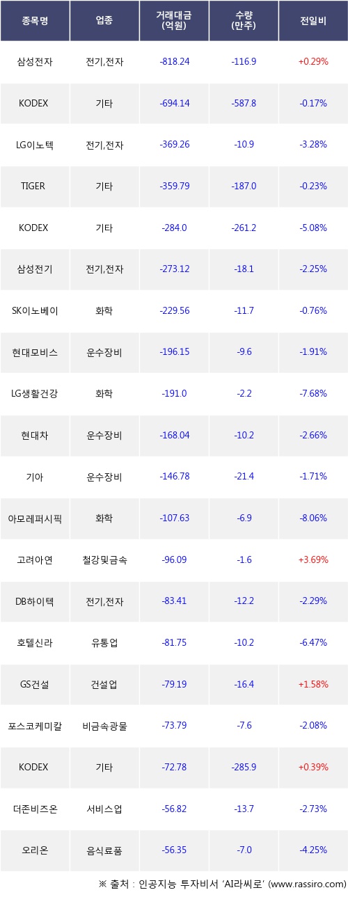 기관 투자자의 순매도 상위 20개 종목은 삼성전자, KODEX 200TR, LG이노텍, TIGER 200TR, KODEX 코스닥150 레버리지, 삼성전기, SK이노베이션, 현대모비스, LG생활건강, 현대차등이다.