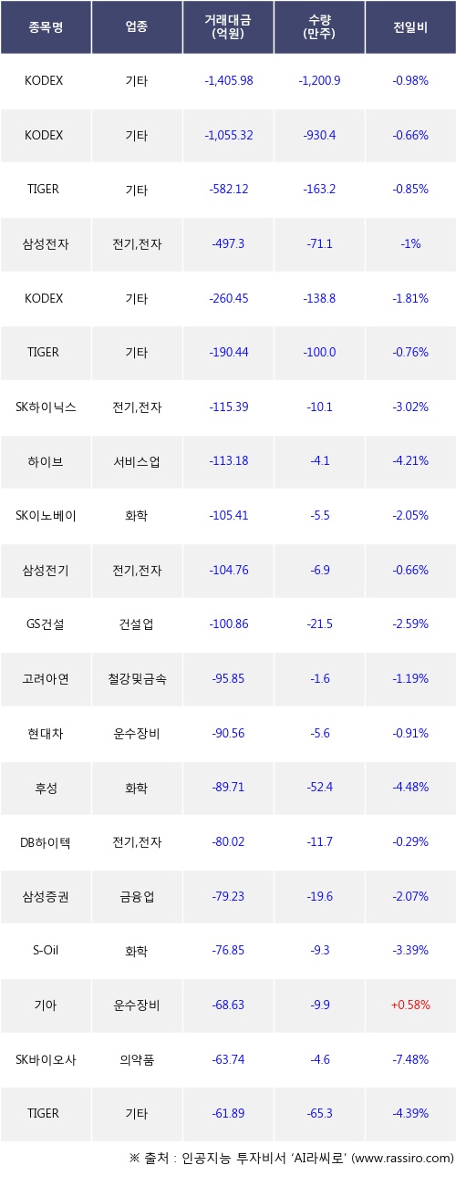 기관 투자자의 순매도 상위 20개 종목은 KODEX 200TR, KODEX MSCI Korea TR, TIGER 200, 삼성전자, KODEX 레버리지, TIGER 200TR, SK하이닉스, 하이브, SK이노베이션, 삼성전기등이다.