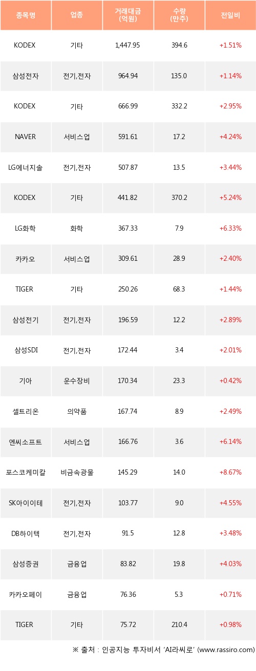 이날 기관 투자자가 순매수한 종목들 중에 KODEX 200, 삼성전자, KODEX 레버리지 등은 전일 대비 주가가 상승했다.