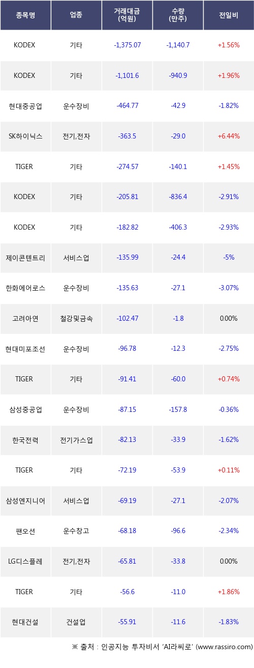 KODEX 200TR, KODEX MSCI Korea TR, SK하이닉스 등은 전일 대비 주가가 상승했고, 현대중공업, KODEX 200선물인버스2X, KODEX 코스닥150선물인버스 등은 주가가 하락했다.