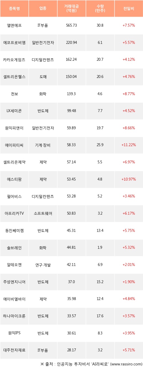 기관 투자자의 순매수 상위 20개 종목은 엘앤에프, 에코프로비엠, 카카오게임즈, 셀트리온헬스케어, 천보, LX세미콘, 원익피앤이, 에이피티씨, 셀트리온제약, 에스티팜등이다.