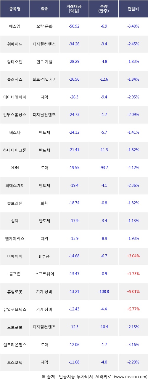 기관 투자자의 순매도 상위 20개 종목은 에스엠, 위메이드, 알테오젠, 클래시스, 에이비엘바이오, 컴투스홀딩스, 테스나, 하나마이크론, SDN, 피에스케이등이다.