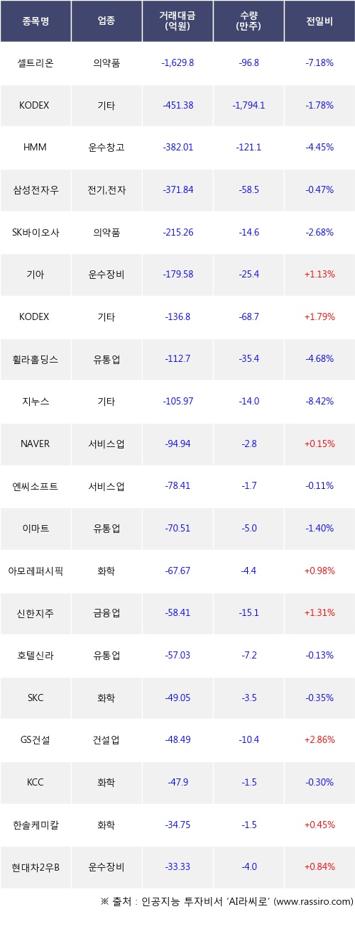 외국인 투자자의 순매도 상위 20개 종목은 셀트리온, KODEX 200선물인버스2X, HMM, 삼성전자우, SK바이오사이언스, 기아, KODEX 레버리지, 휠라홀딩스, 지누스, NAVER등이다.