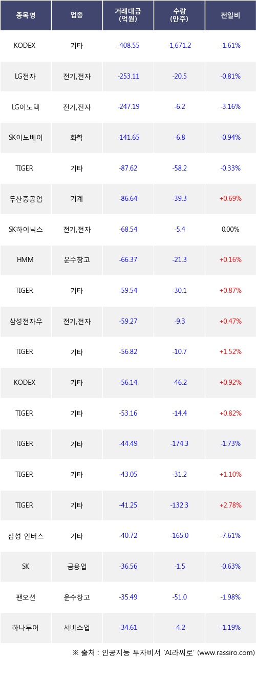 기관 투자자의 순매도 상위 20개 종목은 KODEX 200선물인버스2X, LG전자, LG이노텍, SK이노베이션, TIGER 차이나전기차SOLACTIVE, 두산중공업, SK하이닉스, HMM, TIGER 200TR, 삼성전자우등이다.