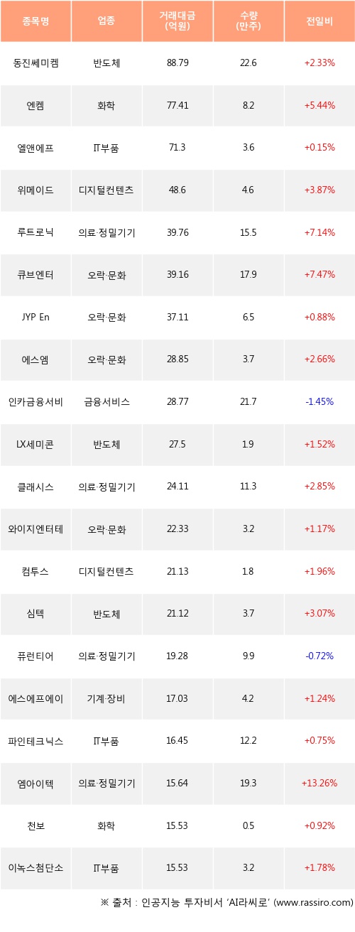 기관 투자자의 순매수 상위 20개 종목은 동진쎄미켐, 엔켐, 엘앤에프, 위메이드, 루트로닉, 큐브엔터, JYP Ent., 에스엠, 인카금융서비스, LX세미콘등이다.