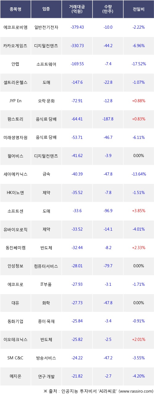 외국인 투자자의 순매도 상위 20개 종목은 에코프로비엠, 카카오게임즈, 안랩, 셀트리온헬스케어, JYP Ent., 팜스토리, 미래생명자원, 펄어비스, 세아메카닉스, HK이노엔등이다.