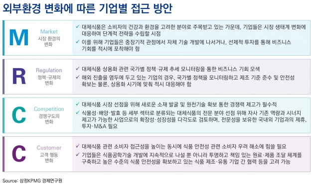 천재준 삼정KPMG 재무자문부문 상무는 "대체식품은 동물 사육 없이 혁신 기술로 단백질을 구현하고 농축산업의 탄소배출을 감축해 지속가능한 소비를 실현시킬 수 있는 대안으로서 기대되는 분야"라며 "친환경과 지속가능성을 강조하는 ESG(환경·사회·지배구조) 경영 측면에서도 기업이 주목해야 할 분야"라고 말했다.