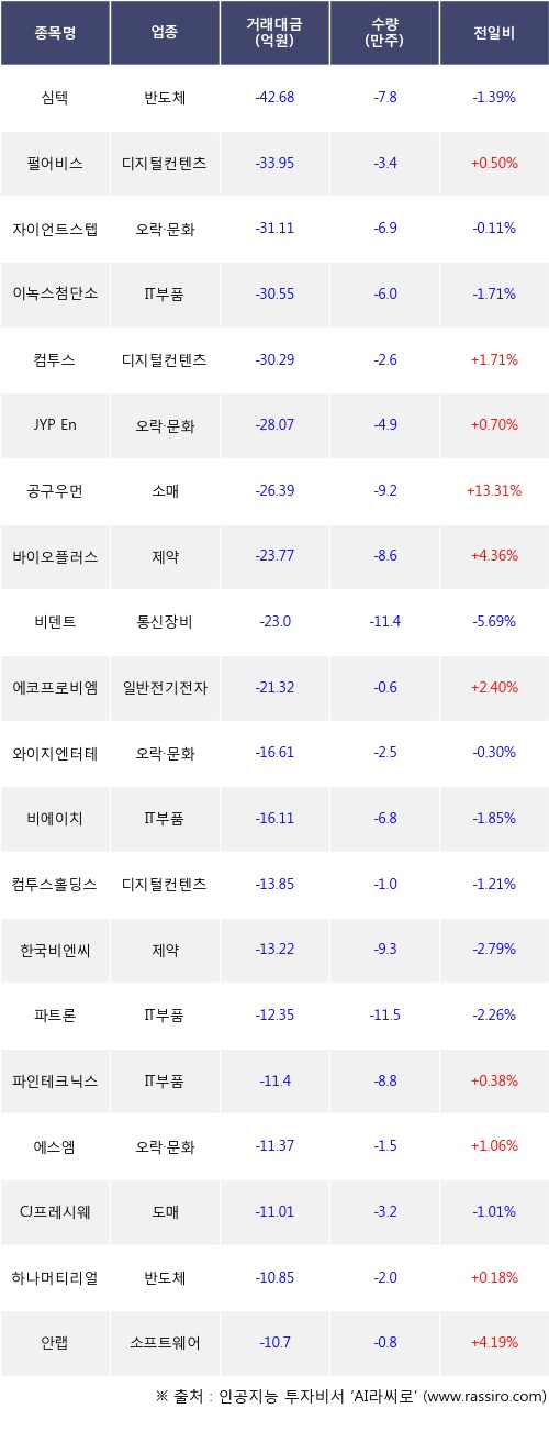 기관 투자자의 순매도 상위 20개 종목은 심텍, 펄어비스, 자이언트스텝, 이녹스첨단소재, 컴투스, JYP Ent., 공구우먼, 바이오플러스, 비덴트, 에코프로비엠등이다.